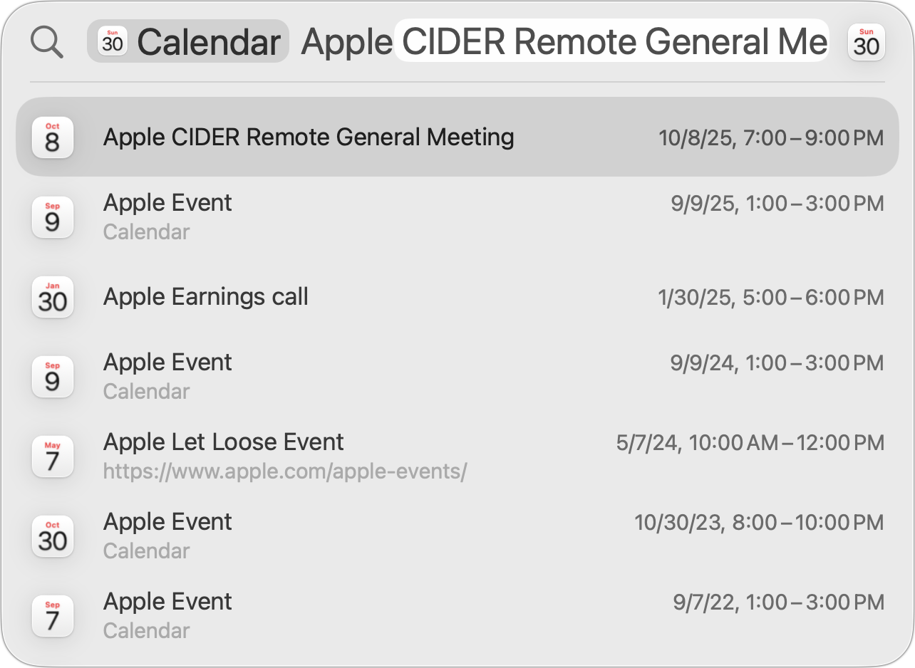 Having all the results in a single window may still be overwhelming, so Spotlight now lets you filter the results in several ways. Most notable is the horizontally scrollable line of buttons above the search results that lets you filter the results list to particular files or data types, results from specific apps, files stored in a third-party file provider like Google Drive, and even menu items. For example, clicking the Calendar button above the results shows only matching events.