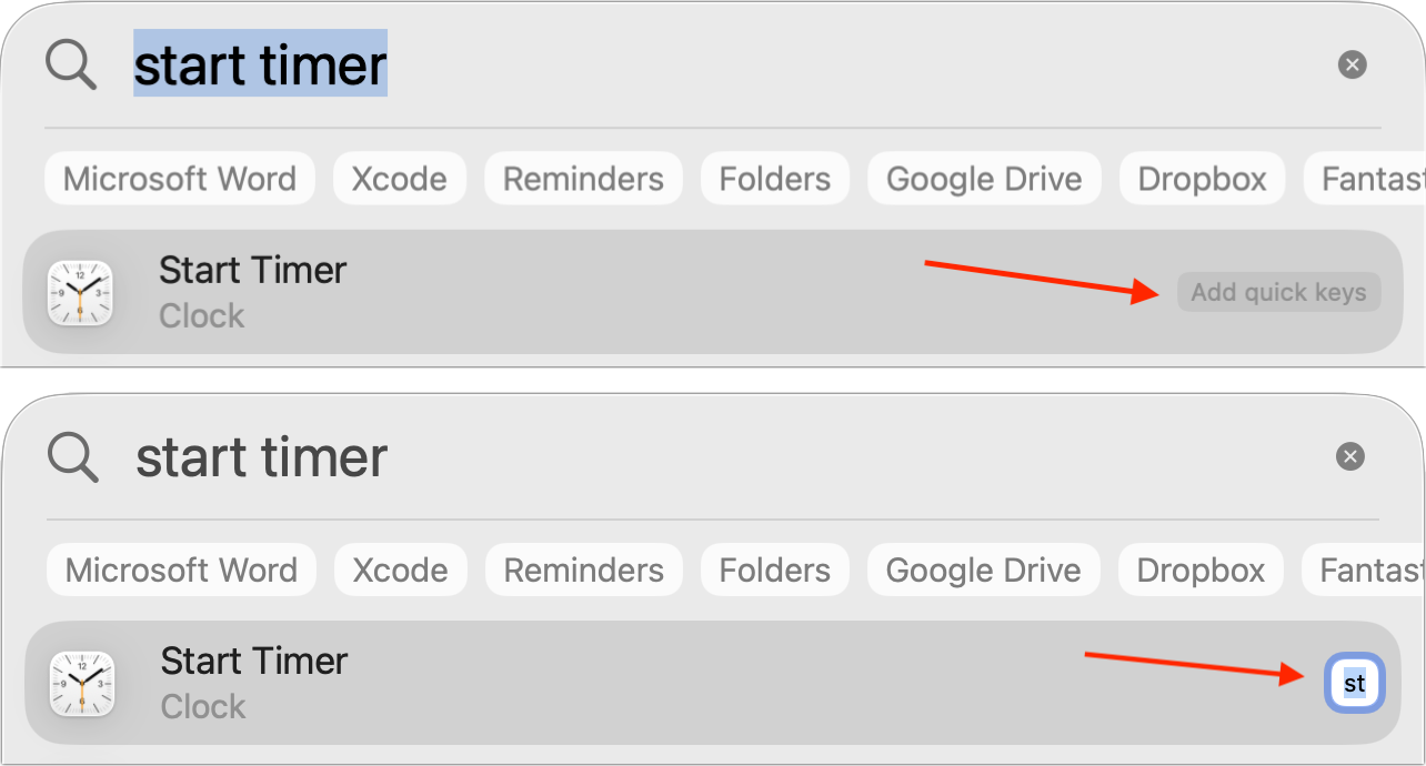 For actions you perform regularly, you can speed things up by defining Quick Keys, which are character sequence shortcuts that stand in for the full action name. For example, you could set it up so that typing st in Spotlight expands to start timer.