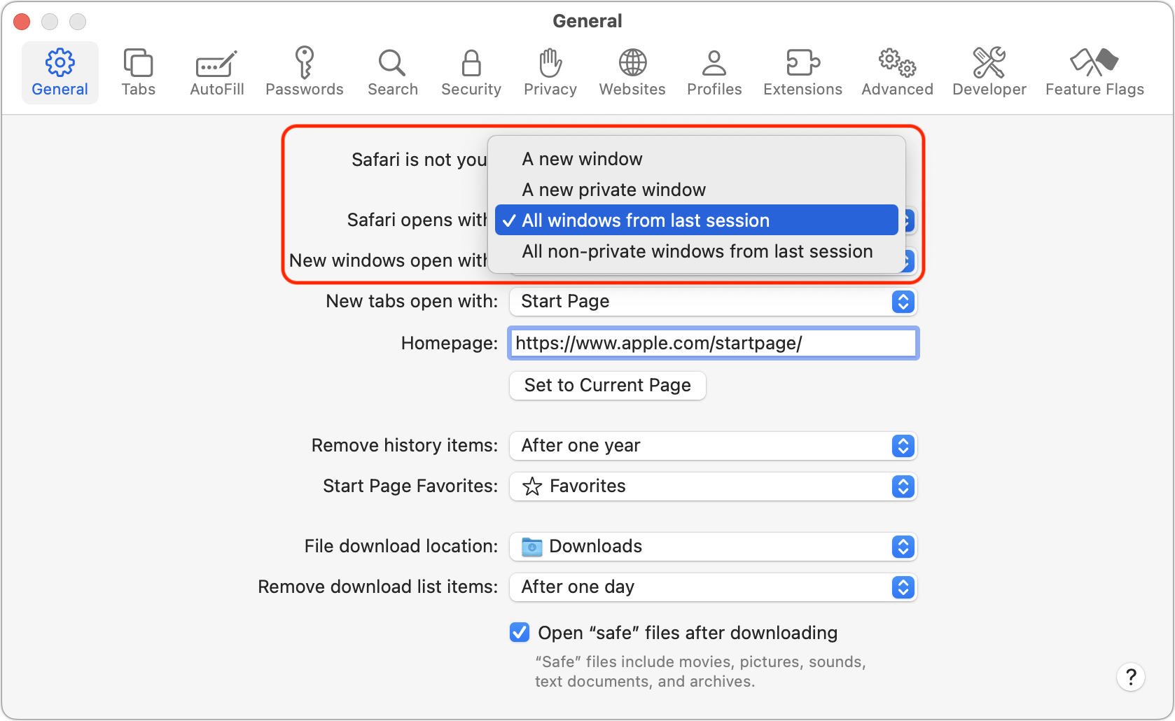 - Custom session restore: Some apps manage session restoration on their own, most notably Safari and apps built with the Electron framework, such as Slack, Discord, and Notion. For instance, in Safari > Settings > General > Safari opens with, you can choose a new window, a new private window, all windows from the last session, or all non-private windows from the last session. With such apps, look for internal settings that control their behavior.